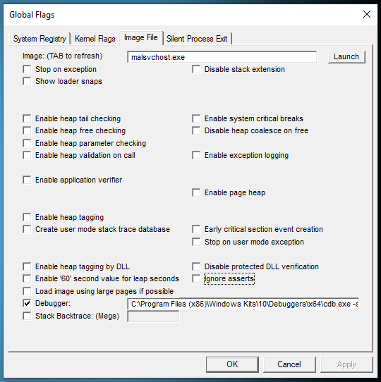 Configuration is very straightforward: we just need to tell it that when malsvchost.exe (a copy of svchost.exe) spawns, we want to run it inside a debugger. The following image shows how gflags should look.
